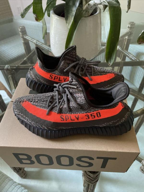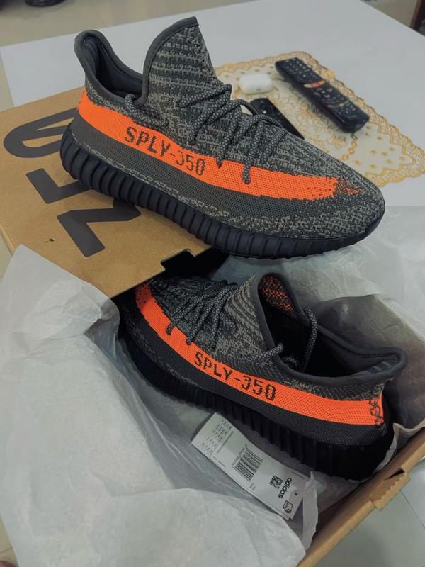 The adidas Yeezy Boost 350 V2 'Carbon Beluga' brings together vivid pops of color with a patterned design. Rope laces secure the breathable Primeknit upper, rendered in a dark grey finish with wavy black lines and contrasting orange speckles. On the lateral side, a matching orange stripe displays 'SPLY-350' branding. Responsive cushioning is provided by a full-length Boost midsole, housed within a ribbed TPU cage and supported underfoot by a durable rubber outsole.
