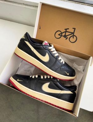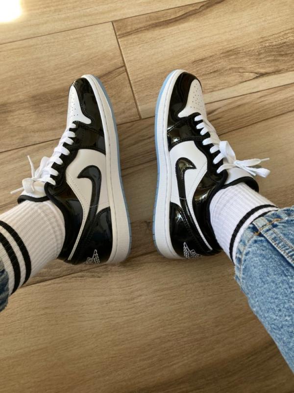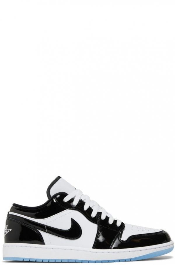 The Air Jordan 1 Low SE 'Concord' borrows colors and materials from an iconic OG colorway of the Air Jordan 11. The white leather upper is contrasted by black patent leather on the forefoot and heel overlay, as well as the signature Swoosh. A Jumpman icon decorates the tongue, while a stitched Wings logo graces the back heel. Inside each shoe, the sockliners are marked with Jumpman' and 'Jordan' in Dark Concord lettering, featuring the same typeface used on the AJ11 tongue branding. A translucent rubber outsole provides durable traction underfoot