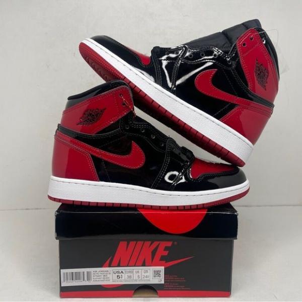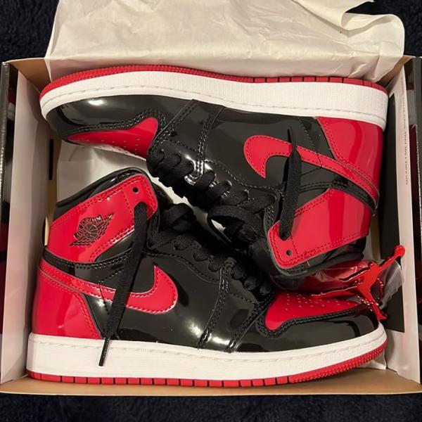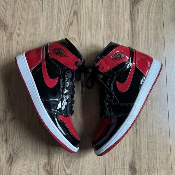 The Air Jordan 1 Retro High OG 'Patent Bred' treats the iconic colorway to a glossy makeover. Aside from the shoe's patent leather construction, the essential design DNA remains intact. The upper pairs basic black paneling with contrasting hits of Varsity Red on the toe box, Swoosh, heel overlay and collar flap. A woven Nike tag adorns the black nylon tongue, while a Wings logo is stamped on the lateral collar. The high-top rides on a sturdy rubber cupsole, enhanced with an Air-sole unit encapsulated in lightweight polyurethane.