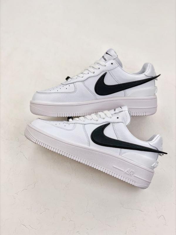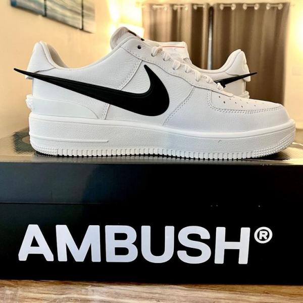 The AMBUSH x Nike Air Force 1 Low 'Phantom' pairs exaggerated details with an essential two-tone palette. Designer Yoon Ahn dresses the low-top in an off-white leather upper, accented with an enlarged signature Swoosh in black TPU. A dual-branded woven tag sits atop a breathable nylon tongue, while 'AMBUSH' adorns the external heel counter in embossed block lettering. Underpinning the sneaker is a durable rubber cupsole in a solid white finish.