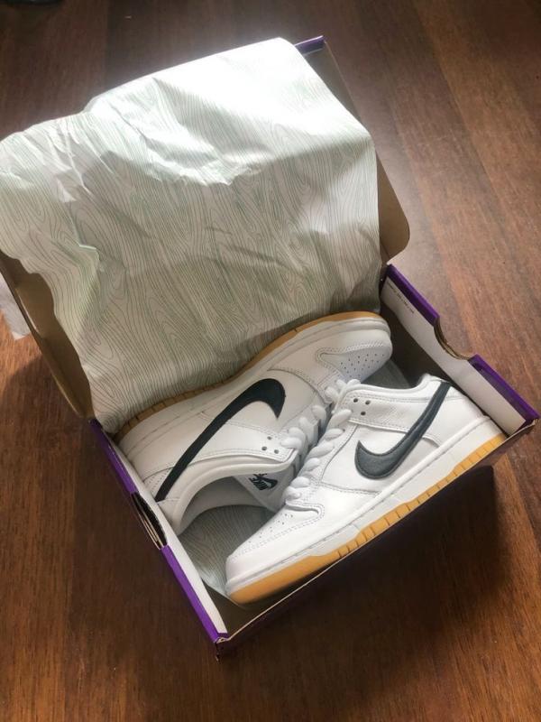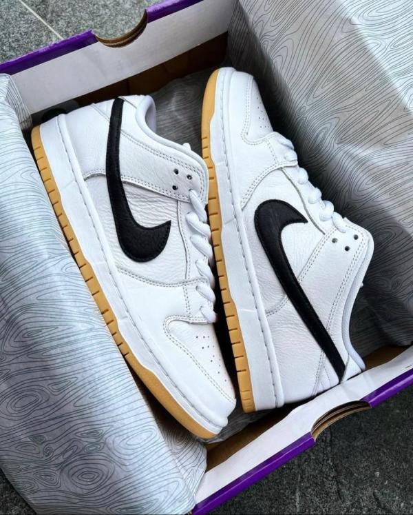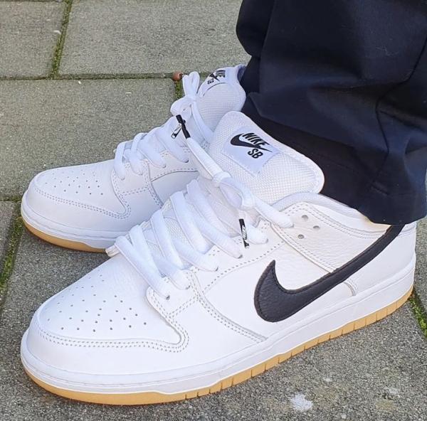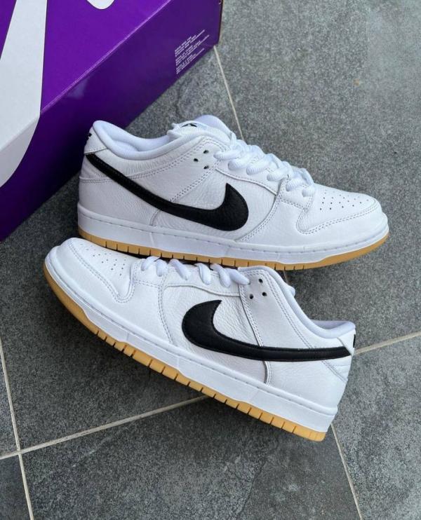 The Nike Dunk Low SB 'White Gum' outfits the retro silhouette in an essential two-tone design. The white leather upper is contrasted by a black signature Swoosh. A woven Nike SB tag adorns the stuffed mesh tongue, which combines with a padded low-cut collar to deliver a comfortable fit. The insole packs a Zoom Air unit in the heel for lightweight cushioning and impact protection. Underfoot, a grippy gum rubber outsole offers superior board feel.