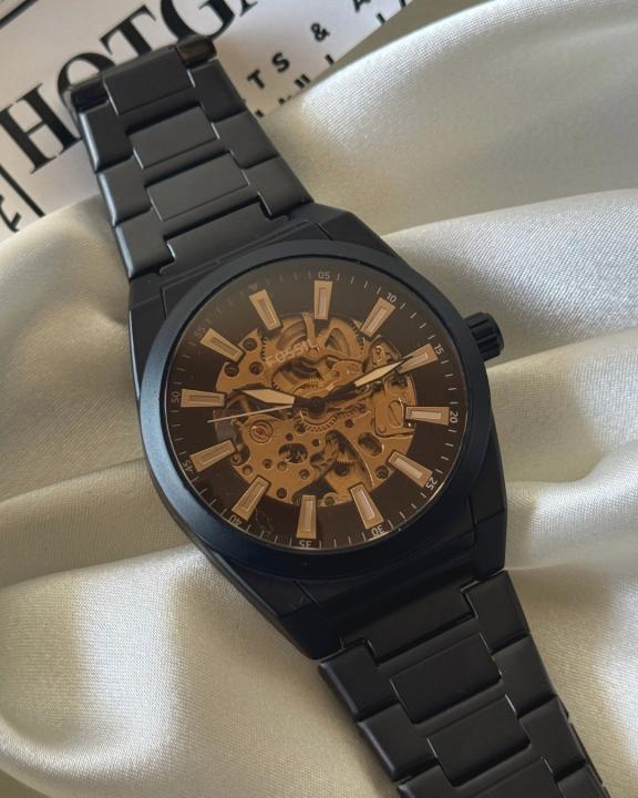 FOSSIL EVERETT AUTOMATIC BROWN SKELETON DIAL BLACK METAL BACK OPEN