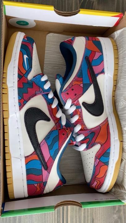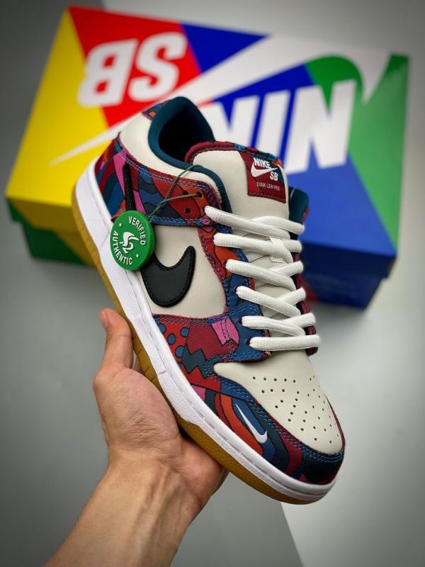 The Parra x Nike Dunk Low SB is drawn from a collaborative series paying tribute to the 2021 Summer Olympics in Tokyo, where the sport of skateboarding makes its official debut. The Dutch artist Piet Parra dresses the low-top in off-white leather with abstract-print textile overlays in a blend of blue, red, pink and teal hues an eye-catching design repeated on Nike SB's Olympic Federation Kits. A truncated black leather Swoosh adorns the quarter panel, while a white mini-Swoosh is embroidered on the lateral forefoot. A tacky gum rubber outsole provides durable traction underfoot.