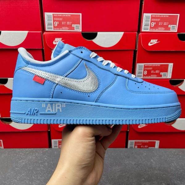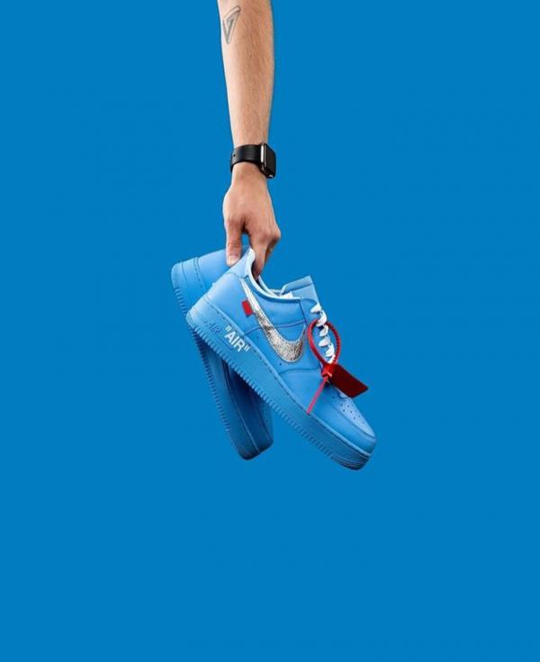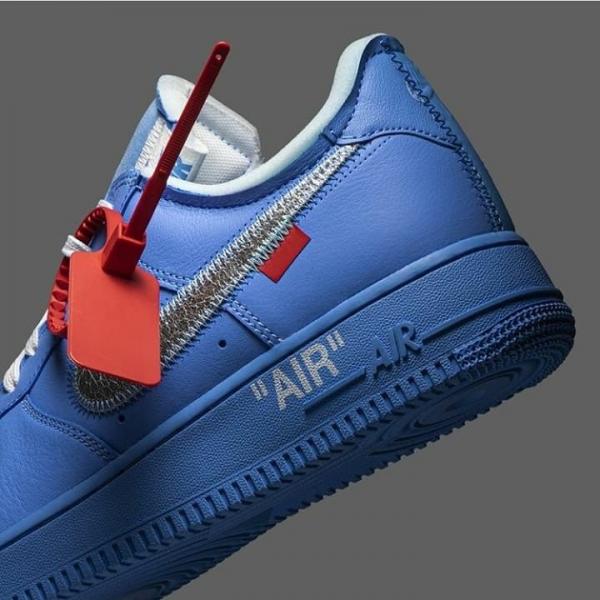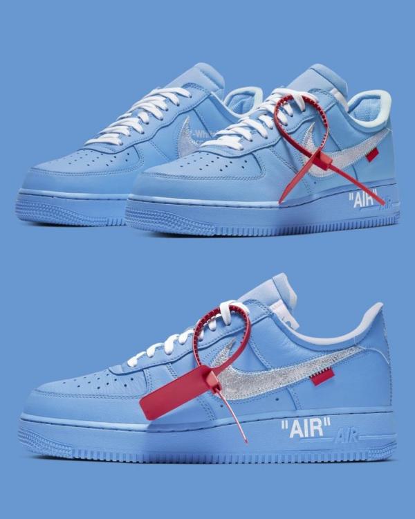 In celebration of his exhibit premiering at the Museum of Contemporary Art in Chicago in June 2019, Virgil Abloh teamed up with Nike once again to produce a Nike Air Force 1. The Off-White x Air Force 1 Low '07 'MCA' shoe features a University Blue leather upper and a Metallic Silver Swoosh with prominent stitching and a signature red tab. For a full circle-feel, the shoe reprises key design details from previous Off-White offerings, including the iconic zip tie and quoted branding